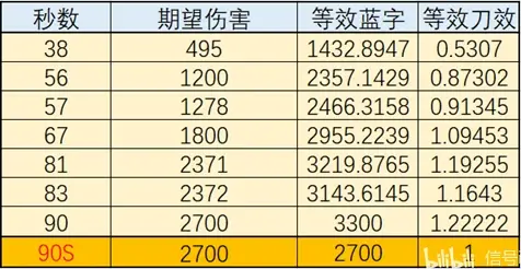 从该表可以明确看出,收满补的情况下,可以获得最高的期望等效蓝字打到最高的等效刀效。其实这就对应着我们正常指挥时的基本思路,以最接近的伤害收一个满补,肯定是最赚的。但是话又说回来,收满补很难控制其余刀的刀伤,一旦其余刀的刀伤总和很接近boss的血量,收满补的刀效就会降低。因此往往这个表并不会考虑90S的情况。