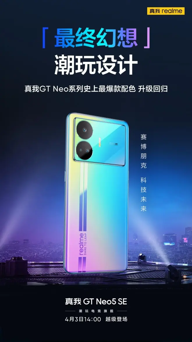 此次除了官宣定档4月3日发布,官方也首次曝光了新产品的外观设计。根据真我realme副总裁、全球营销总裁、中国区总裁徐起介绍,此次真我GT Neo5 SE推出的配色命名为“最终幻想”。提到这个配色,相信有的realme老粉可能已经意识到名字似曾相识,没错这个配色就是在百万级销量爆款Neo一代的“最终幻想”上进行回归升级。
