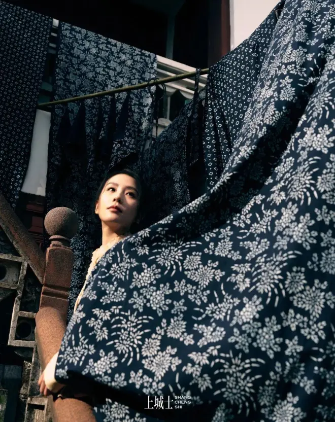园内与园外,仿佛是两个世界。门庭之外,瓦楞、木窗、小吃、声调,烟火气十足;门庭之内,清淳幽静,处处可画,时时有诗。刘诗诗立足于一处阁楼小院,手上摩挲着一条蓝印花布,花布一条条垂落在古楼之上,厚重的灰与有生命力的蓝交织,形成一幅极具视觉冲击力的图画。