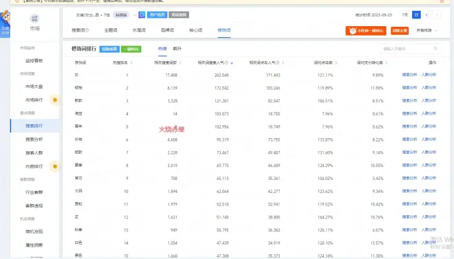 这个是生意参谋市场的搜索排行,那排行里面,这个是类目词,就是你所属的类目,那这下面,可以看修饰词,那这里就包含很多的词根,这些词根会有几百个。