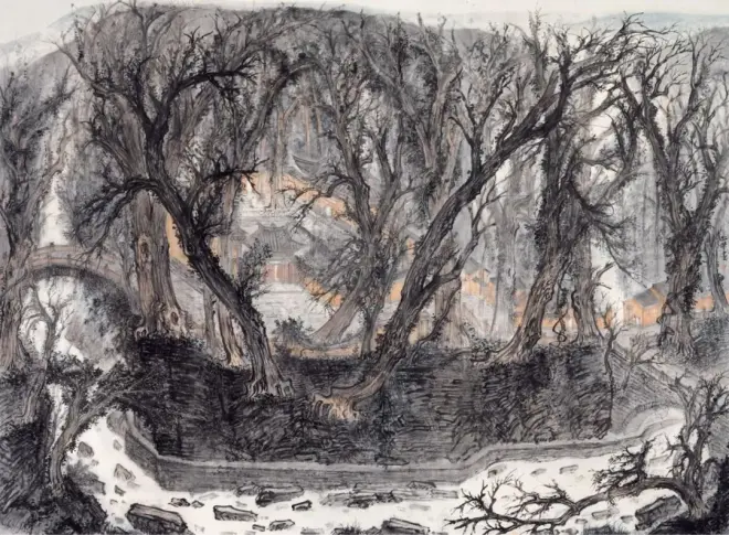 正杰生于江南,但深观其作,却无浙派山水画所惯见的纤巧秀静,倒是一派浑然敦厚,矫健有力。他画得浑朴真率,不雕不饰,千仞岗、万里流,有份岿然不动的从容。简朴是介乎炫饰与粗鄙之间的一种品性。相比那些旁骛过多,未能善用其才的画人,正杰性情倔犟,其画亦如其人,纵横雄肆,舍本土而求远,竟有一种筚路蓝缕以起山林的气象。如今正处盛年的正杰,仿若那位身体力行的掘井者,当“掘井九轫而不及泉”时,怎么办?何须惘然,唯运所致。