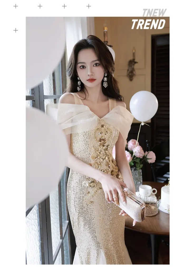 亮片晚礼服裙女吊带一字肩仙气高端轻奢小众高定主持宴会生日闪夏