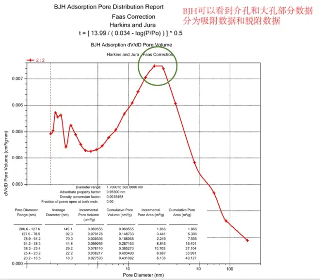 BJH吸附和脱附孔径分布绿色圈框起来的峰位置和强度都一样,代表样品的峰。脱附中蓝色蓝色框起来的位置是大概3.8nm出现的,是假峰,出现原因可能是内部孔道连通性、孔隙多样性、孔隙分散性等,不能认定为样品的峰。一般脱附没有假峰选择脱附作为最终数据,有假峰就选用吸附得到的数据。