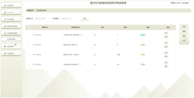 管理员点击考试题目管理。在考试题目页面输入模拟考试,考试题目进行查询,新增,删除,导出,打印考试题目列表,并根据需要对考试题目详细信息进行修改、或删除操作。如图5-9所示: