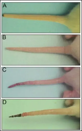 尾巴出现的环形收缩,严重者尾尖处坏死脱落,偶发于脚趾。Wistar易感,多发于年幼大鼠。主要原因是饲养环境的相对湿度过低(<40%)。