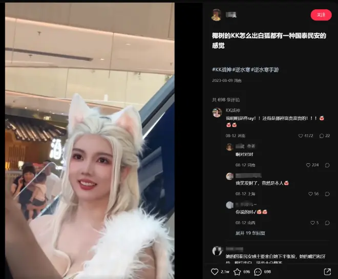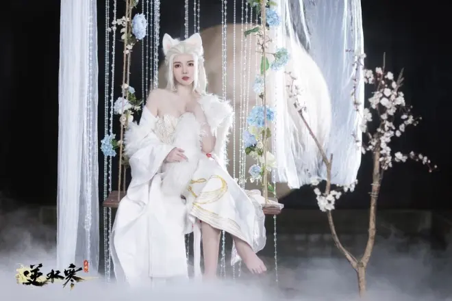 正好近期《封神第一部》热映,娜然演绎的妲己也引发了全民对狐狸祥瑞的热捧。逆水寒官方也邀请了椰树直播间的知名模特KK战神来COS游戏中的白狐时装,被玩家夸赞为“国泰民安脸”、“真祥瑞”。
