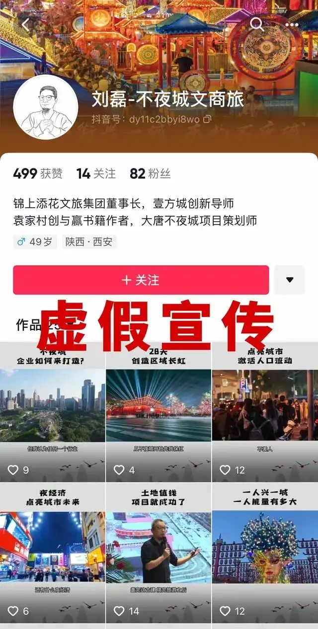 16日,曲江文旅通过抖音平台发布一份声明,声明称发现网络流传“西安锦上添花文旅集团就是西安大唐不夜城的打造者”及“该集团董事长刘磊为大唐不夜城项目策划师”等不实消息,“该集团及其相关人员打着该旗号预与多家单位达成合作,该集团及其相关人员虚假宣传行为给我司已造成严重不良的社会影响。”
