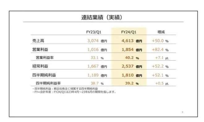 任天堂近日公开了2023~2024年第一季度的财报(4月1日至6月31日),净利润达到1810.2亿日元,同比暴涨52%。