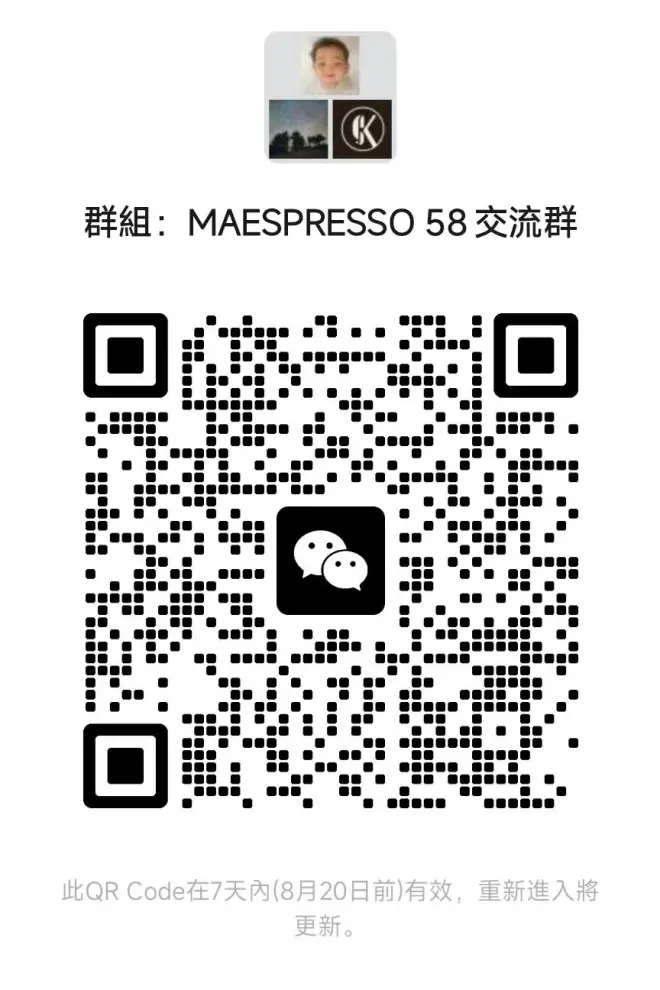 經過一年時間的努力,MAESPRESSO 58的基礎設計已經定型。現在剩下的就是一些配件的優化工作,這時候更需要各位B站大神的意見。有興趣試用的朋友可以加入我這個微信群,我會在群裏選出幾位資深的咖友試用產品,以此徵集各方好友的意見,為產品作最後的優化[打call]