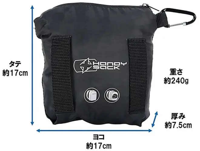 袋子由轻便耐用的100%涤纶制成,重量约为240克。打开可以变身成一个体积为17*17*7.5 cm的背包,还带有一个登山扣。15L的容量,可以轻松收纳头盔。不使用时,整理收纳后仅仅一个手掌大小,可放入您的口袋,是不是很方便呢?