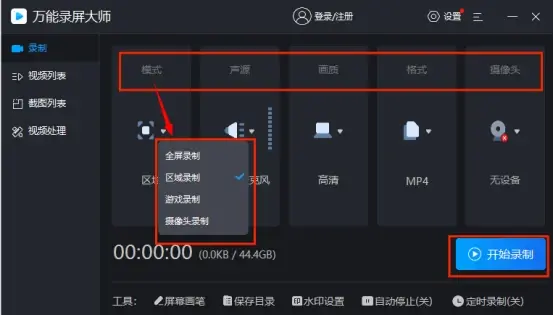 2.下载成功后,打开软件页面可以看到右下方有一个开始录制的按钮,直接点击后选择录屏区域,如果是要录制游戏则可以像我前面提到的在模式中选择游戏模式进行录制,又或者是长时间的录屏,那可以使用系统下方的自动停止或定时录制功能,就不用一直坐在电脑前啦,另外在录制前即可控制声源,画质等这些设置