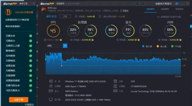 当然帧率监测软件也会对资源有一定的占用,对帧率和稳定性方面也有一定影响,不过从GamePP的监测来看,在游戏过程中帧率波动并不算大,显卡占用率比较高,基本吃满,处理器和内存富余量很大,并且温度控制的还不错,在1080P下畅玩3A还是没问题的。