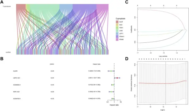 我们从 TCGA 数据集中获得了 1,109 个乳腺癌样本和 103 个相邻样本的表达。共筛选出13493个lncRNA。将通过 Wilcox 检验获得的在乳腺癌和邻近样本中差异表达的 lncRNA 纳入后续分析 ( p < .05)。我们通过相关性检验确定了与铜凋亡相关的 lncRNA。Pearson 相关分析表明,153 个 lncRNA 与乳腺癌中的铜细胞凋亡相关基因相关(Cor <.3,p值 <.05)。Sankey图谱显示了7个Cuproptosis相关基因与153个Cuproptosis相关lncRNAs的对应关系