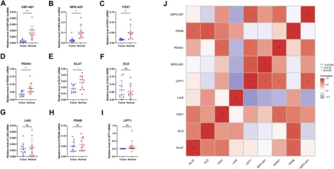 对来自 10 名乳腺癌患者的原发性乳腺癌组织和癌旁正常组织进行了 qPCR。结果表明,两种模型 lncRNA 在癌症和 Para 癌样本中均有差异表达,USP2-AS1 和 NIFK-AS1 在癌症样本中的表达均较低。FDX1、PDHA1 和 DLAT 在乳腺癌中也显着下调。使用实验表达构建了七个铜凋亡相关基因和两个模型 lncRNA 的相关热图。结果显示USP2-AS1的实验表达与PDHA1呈正相关,NIFK-AS1与LIPT1呈正相关,这与之前的生物信息学预测一致。