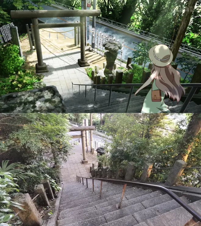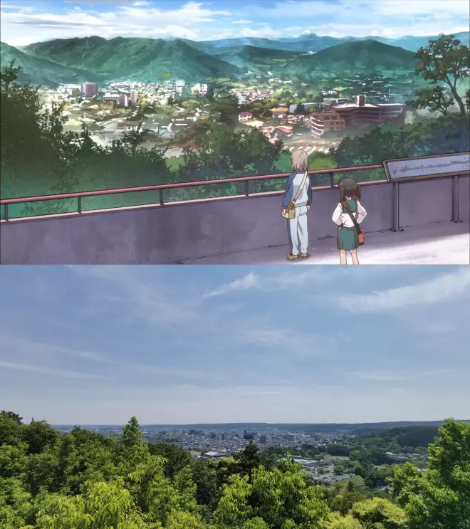 说回天览山正路,就是实线线路。这也是主角们登山之路开始的地方,一路上处处是熟悉的风景。也会有很多当地人爬爬山锻炼身体,记得跟他们打招呼哦(动画中日向说的很真实,日本的登山客都会在互相遇到的时候打招呼“こんにちは”)。不过197米的标高对于经常户外的朋友们来说可能确实不太够看,十几分钟就能登顶,来到天览山展望台。如果天气好的话,展望台可以看到很远的地方(据说甚至能看到东京晴空树,但是我好像没看到)。如果带了便当的话可以去展望台后面的小亭子(这个小亭子在ed中出现过)吃,休息一下继续下一站!