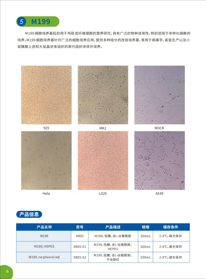 1950年Morgan等设计的具有确定化学成分的细胞培养液,即M-199。除BSS外,含有53种成分,为全面培养基,主要用于鸡胚成纤维细胞培养。此培养液必须辅以血清才能支持长期培养。M-199可用于培养多种种属来源的细胞,并能培养转染的细胞。现广泛用于病毒学、疫苗生产。