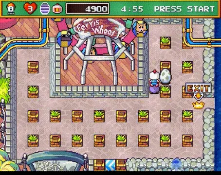 其次是游戏加入了宽屏游戏模式。在这里的宽屏模式,并非是指游戏的视频输出制式发生了改变,而是通过压缩游戏场景,并依赖于32位CPU的处理能力,制造出一个最多容纳10名玩家的16:9地图。相比于4:3比例,这张地图同时表现了更多的游戏物体、对演算能力的要求也更高。即使是当时最先进的32位处理器的演算能力,也仅能勉强同时处理如此大量的玩家操作和人物动画。由于10人游戏时的消耗极大,游戏工程师还引入闪烁来节省处理器算力,从而导致人物移动时的动画会产生边缘模糊。但这种牺牲带来的游戏体验是极为惊人的,即使十人同时在场景中安放炸弹并引爆,游戏依然以顺滑而流畅的节奏运行,丝毫感受不到移动时的延迟和卡顿。可以称得上是另一场90年代游戏工程上的奇迹。