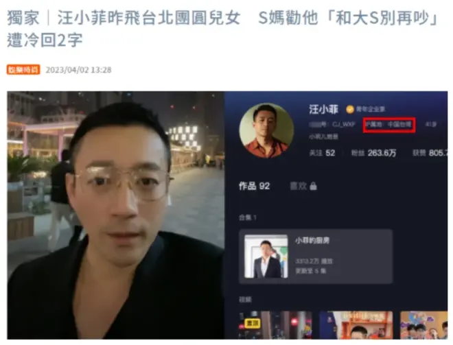 从汪小菲的IP的确可以看到,汪小菲已经来到了台湾省。