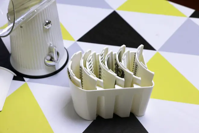 刀片筒上默认安装有切片的刀片,其他四组刀片依次用于波浪刀片、粗丝刀片、扁丝/磨碎刀片以及细丝刀片,完全能够覆盖日常所需切丝、切片或者研磨功能。