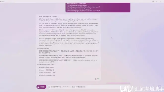 7分:I’m fluent in Chinese and English. I started learning English when I was young and I have been using it for different purposes, such as studying, working and traveling. To keep my hand in, I often listen to podcasts, watch TED talks and join language exchange groups.