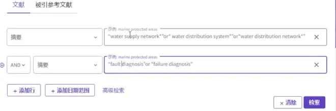 图中行与行之间为and联系,满足所有行的条件的文献将会被检索出。