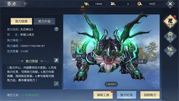 2、势力职务分为宗主、副宗主、供奉、帮众,玩家选择创建势力的话自动成为宗主,身为最高领袖宗主拥有诸多的管理权利,例如提升势力成员的职务等级、颁布势力宗旨、进行势力等级等