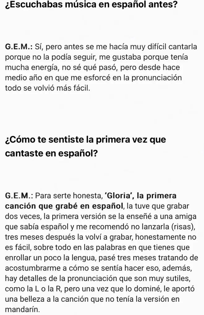 G.E.M. : 老实说,《Gloria》是我用西班牙语录制的第一首歌,我录了两次,第一个版本我给一个懂西班牙语的朋友看了,她建议我不要发行(笑),三个月后我又录了一次。老实说这并不容易, 我花了三个月的时间去适应这样做的感觉,还有,有些发音细节是非常微妙的,比如 L 或 R,但一旦我掌握了它,它就给歌曲带来了普通话版本所没有的美感。