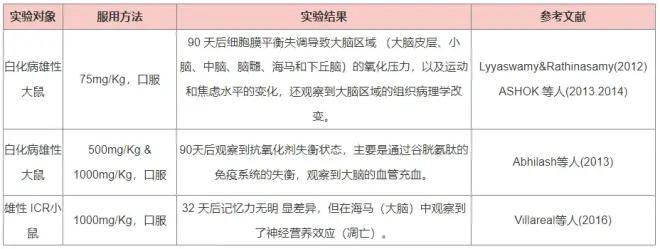 2022年11月,美国加州大学肖境欢在《中国食品工业》杂志上发表题为《阿斯巴甜在动物试验中体现的健康危害》综述论文[3]。文章就阿斯巴甜对动物体血细胞和纤维蛋白、大脑、肝脏、肾脏、神经系统、免疫系统、肠道微生物以及胎盘的影响进行了论述。其中高剂量的阿斯巴甜(>40mg/Kg/d)对大脑的消耗试验结果表明:较高的阿斯巴甜剂量可能导致酶活性的改变。受阿斯巴甜影响的大脑区域可能包括大脑皮层、下丘脑和臀大肌。海马和内侧额叶皮层等区域在记忆和决策中发挥重要作用(表2)。