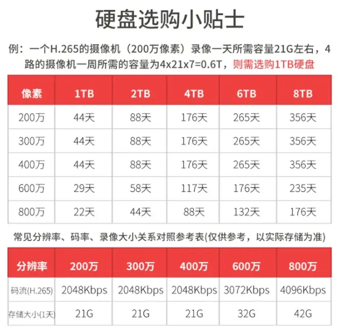 简单计算存储容量,即1T硬盘可以为200万像素的4台H265摄像头录制10天画面,但不绝对