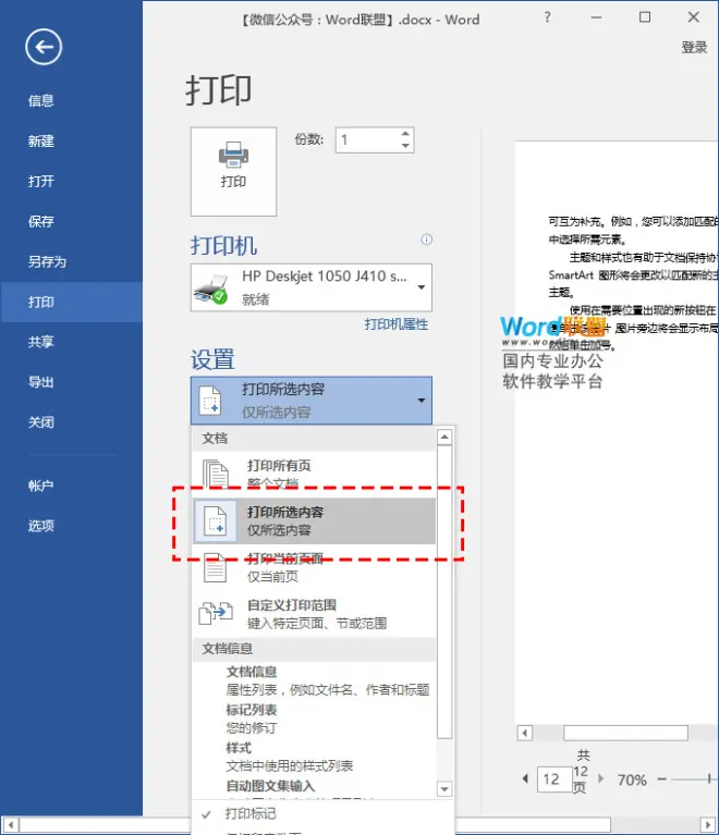 有时候,我们不一定要打印整篇文档所有内容,也不一定要打印某一页,我们或许只会打印其中某段内容。选中文档中需要打印的内容,然后进入「打印」-「设置」-「打印所选内容」即可。