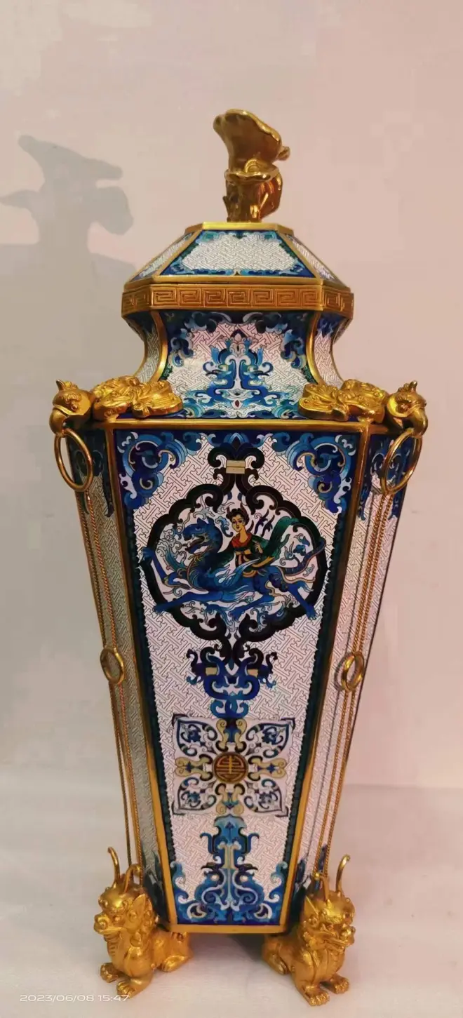 这是一件把铜、釉料、錾雕、宝石、花丝镶嵌等多种工艺融合在景泰蓝工艺中的作品。设计者独具匠心,采用四只威猛的瑞兽为底座,托起一尊线体流畅的四面四棱方尊。纹饰为极其精致的万字锦地,衬托出青龙、白虎、朱雀、玄武四神图案,人物生动、细腻流畅,四支鹏鸟飞落在方尊肩部,口衔着铜环连接花丝绳,尊顶部一组宝石雕刻的灵芝,使整件作品超风脱俗,具有动态美感,色调古朴典雅、雍容华贵。