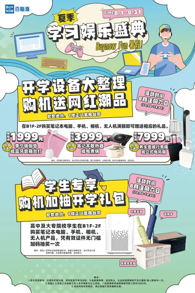 8月1日-31日(周六日)在B1F-2F购买笔记本电脑、手机、相机、无人机满额即可赠送相应的礼品兑奖地点:百脑汇1楼客服台旁。