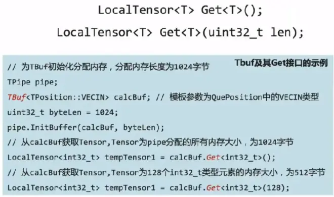 编程过程中使用到的临时变量内存同样通过Pipe进行管理。临时变量可以使用TBuf数据结构来申请指定QuePosition上的存储空间,并使用Get()来将分配到的存储空间分配给新的LocaLTensor从TBuf上获取全部长度,或者获取指定长度的LocalTensor。