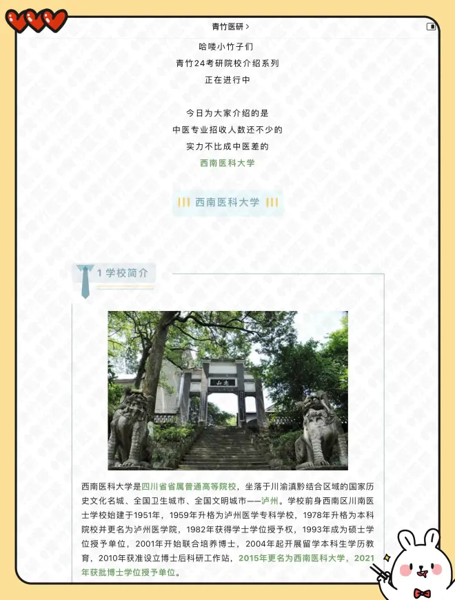 哈喽小竹子们~青竹医研24考研院校介绍系列开始发布。今日为大家介绍的是,招收人数不少,实力不比成中医差的【西南医科大学】,点赞收藏不迷路~