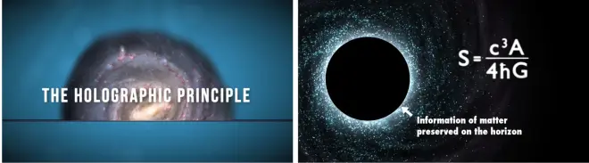 后来通过对黑洞研判得到上的公式,S=(Akc³)/(4ℏG) 科学进一步确认一个空间内所能包含最大熵、并不和其体积成正比,与边界面积正比。于是推断“n维空间内部的世界,可以由其n-1维边界上的信息去描述”。