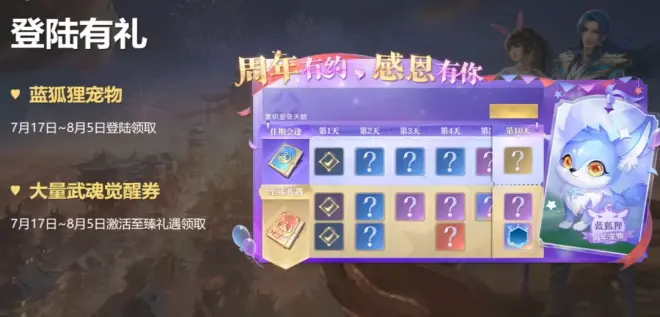 接着是周年庆期间的福利汇总,首先有防辅系SSR魂师的自选(这个不是体验卡,是永久的魂师),需要大家在7月22日当天登录游戏即可通过邮箱获得,强调一下这个自选礼包是包含海马和拓跋云的,另外还有部分钻石/百炼钢等道具的奖励。