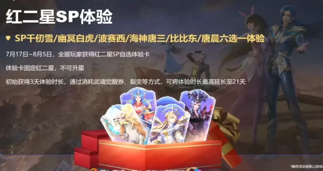 另外还有红色2星SP魂师的体验卡,这玩意就真是体验卡了......可以选择SP大雪/SP白虎/SP波塞西/SP海三/SP比比东/SP唐晨,最低持续3天,最高持续21天,通过消耗武魂觉醒券可以延长体验的时间。