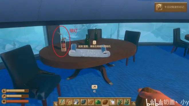 二层有【蓝图:高级生物燃料提炼机】、【喷灯】、【自动贩卖机标识】