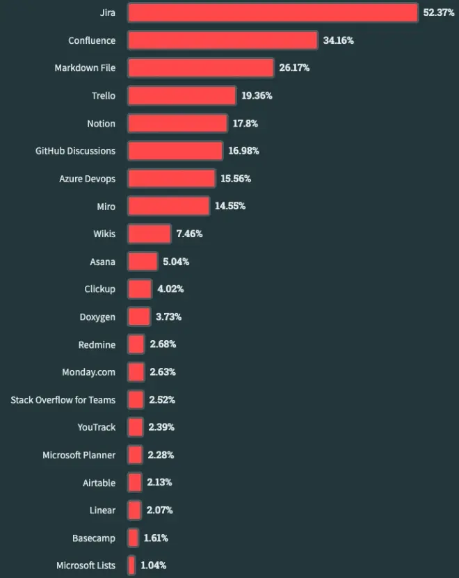 数据显示,Jira 和 Confluence 是所有开发人员中排名前两位的异步工具,与去年类似,但今年榜单有一名新成员闯入 Top3:27% 的受访者将 Markdown File 用作异步工具。