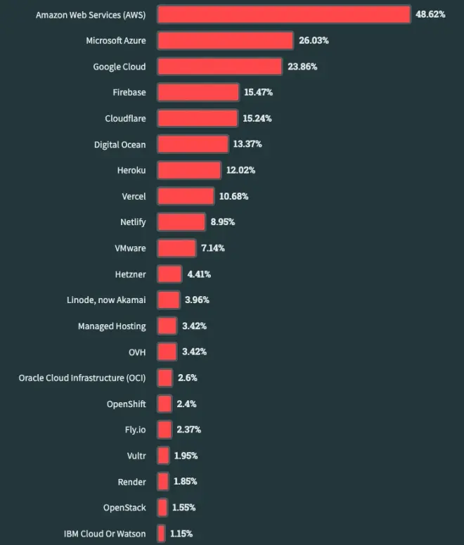 AWS 仍然是所有开发者最常用的云平台,使用率几乎是所有受访者使用第二多的云平台 Azure 的两倍。