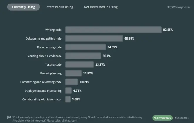 数据显示,70% 的受访者正在或计划在其开发过程中使用 AI 工具。那些学习编码的人比专业开发人员更有可能使用 AI 工具(82% vs. 70%)。