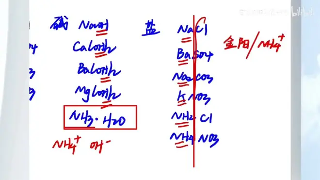 碱;《金属阳离子&铵根离子》+氢氧根离子(特殊;氨水→一水合氨==铵根离子和氢氧根离子)