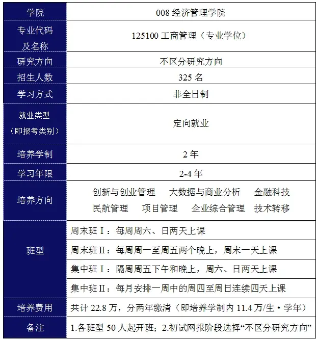 北京航空航天大学工商管理硕士(以下简称“北航MBA”)招生工作坚持公开公平公正、全面衡量、择优录取、宁缺毋滥的基本原则,2023年拟招收325名工商管理硕士研究生(专业代码及名称:125100工商管理)