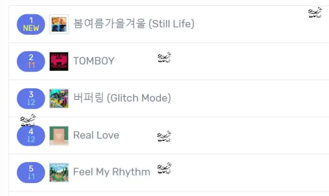 韩国网友搜索很多的歌曲的主人公分别有:Bigbang,gidle,NCT,red velvet,ohmygirl,highlight,朴宰范,IU,NMIXX,IVE,STAYC,少女时代,金泰妍,Stray Kids,aespa,EXO,金俊勉,SUHO,BraveGirls,IZONE,崔叡娜,文泰一,Gfriend,VIVIZ等。