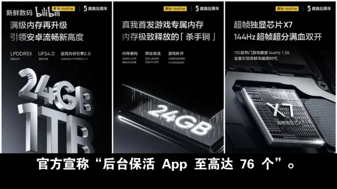 真我 GT5 采用 24 GB LPDDR5X 超大物理内存 和1TB UFS4.0 超大存储,搭载“旋风内存引擎 2.0”,官方宣称“后台保活 App 至高达 76 个”。
