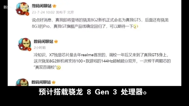 据了解,除真我 GT 5外,该系列还将配备Pro 版,预计搭载骁龙 8 Gen 3 处理器。