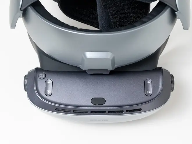 在头显的顶部,有10档音量调节键、10档亮度调节键和3D功能键。这几个按键在形状、位置都有明显区分,能够很轻松地实现盲按,使用的时候就不需要摘下头显了。