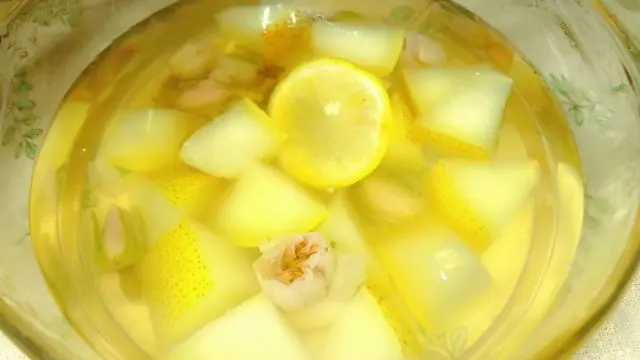 2. 雪梨水开后5分钟加入准备好的玫瑰花、干柠檬片、冰糖再煮5分钟即可出锅;