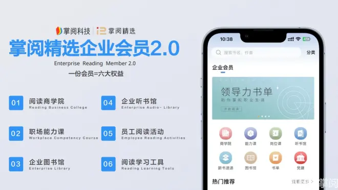 此外,掌阅精选还针对企业面临的阅读效果延展性、持续性较弱的痛点问题,综合多年服务经验,发挥数字阅读平台优势,面向服务侧推出了最新的企业阅读服务方案—‘掌阅精选企业会员2.0”,下设 阅读商学院”“职场能力课”“企业图书馆”“企业听书馆”“员工阅读活动”“阅读学习工具”六大权益,可为企业在推广阅读、组织培训、能力提升、职场赋能等方面提供成熟完善,领先品质的服务。