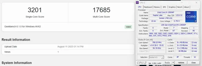 图3是仅启用8P时的测试得分,图4同样增加了hwinfo的截图,用来对比图2,以证明两次测试均处于默认状态,在仅开启P核时并不存在超频.
